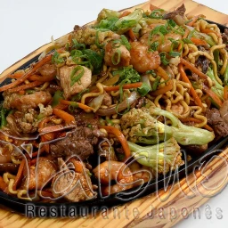 Chapa MistaPeixe, Frango, Carne, Calabresa, Camarão, Yakimeshi, Salada e Batata Frita.R$110,00